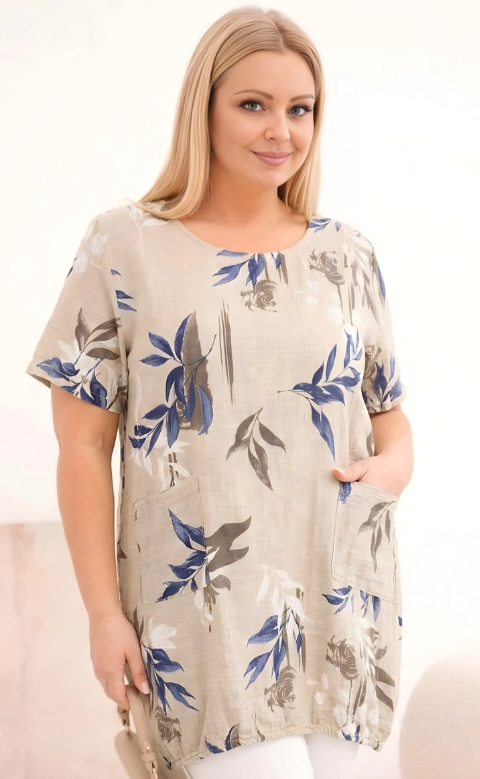 Dámska bavlnená blúzka plus size s krátkym rukávom je ideálnou ponukou pre ženy, ktoré si cenia pohodlie, prírodné materiály a módny vzhľad. Voľný strih zabezpečuje slobodu pohybu a pekne padne na postave, zatiaľ čo jemný rastlinný vzor dodáva celku ľahkosť a svieži charakter.