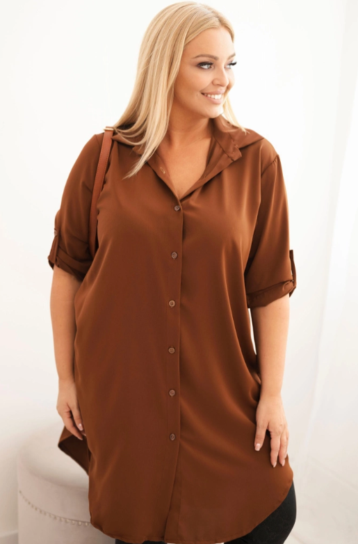 Dámske košeľové šaty Plus Size je vynikajúca kombinácia elegancie a pohodlia v každodennom štýle. Jej voľný strih zabezpečuje, že sa krásne prispôsobí postave, pričom poskytuje plný komfort nosenia bez ohľadu na príležitosť. Klasický golier, gombíková léga po celej dĺžke a praktické rukávy 3/4 s možnosťou podhnutia robia túto sukňu univerzálnou voľbou na mnoho sezón.