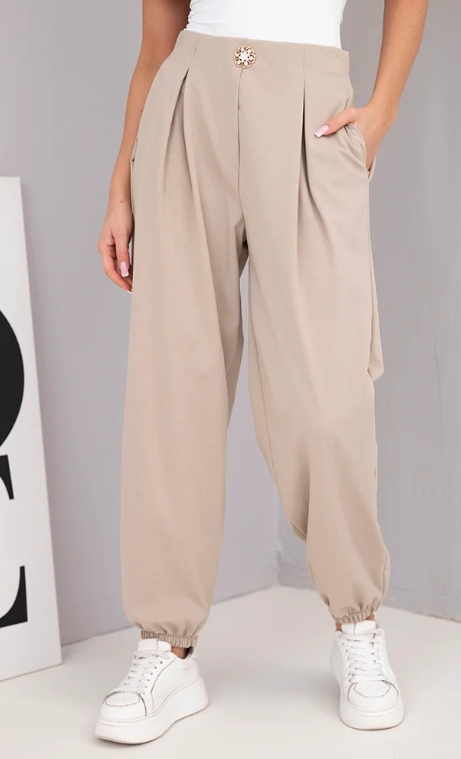 Tieto elegantné dámske nohavice s vysokým pásom sú návrhom pre ženy, ktoré si cenia kombináciu pohodlia a štýlu. Voľný strih s jemne zúženými nohavicami zakončenými stiahnutím vytvára, že nohavice sa pekne prispôsobujú postave a hodia sa do mnohých štýlov – ako každodenných, tak aj elegantnejších. Ozdobný gombík vpredu pridáva na ich pôvabe a klasickom dokončení. Výborne sa kombinujú s blúzkami, topmi alebo sakami, čím vytvárajú módny a ženský vzhľad.