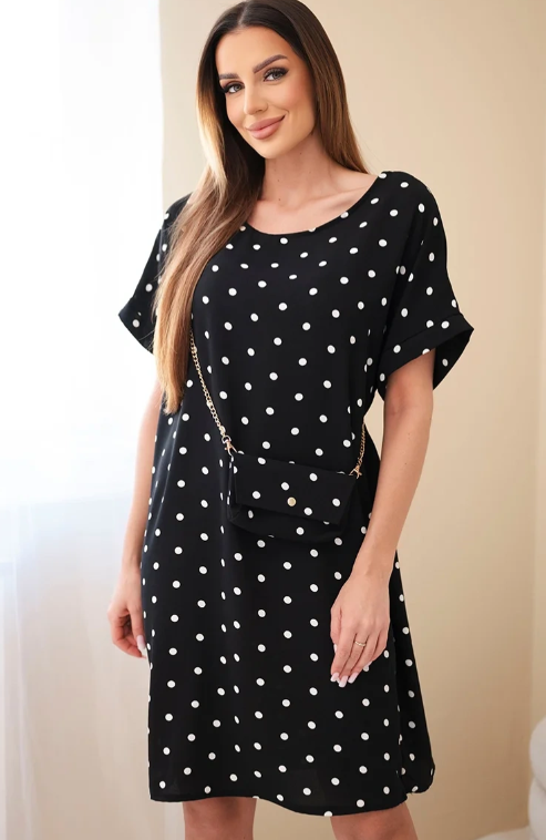 Dámske oversize šaty s bodkami a krátkym rukávom sú štýlovou a pohodlnou voľbou na bežné nosenie aj letné vychádzky. Klasický vzor s bodkami im dodáva nadčasové čaro a voľný strih zabezpečuje maximálne pohodlie pri nosení a voľnosť pohybu. Model sa vyznačuje aj praktickým doplnkom v podobe malej kabelky na retiazke, ktorá dokonale dopĺňa celú štýlizáciu.