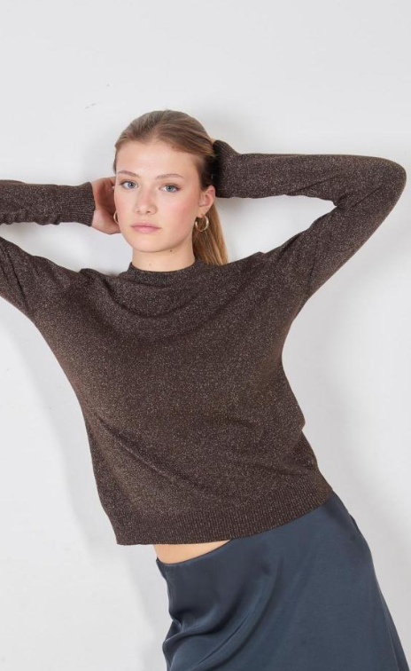 Sveter s dlhým rukávom pretkaný s lurexovou niťou. Má okrúhly výstrih. Vhodný aj na elegantno.
