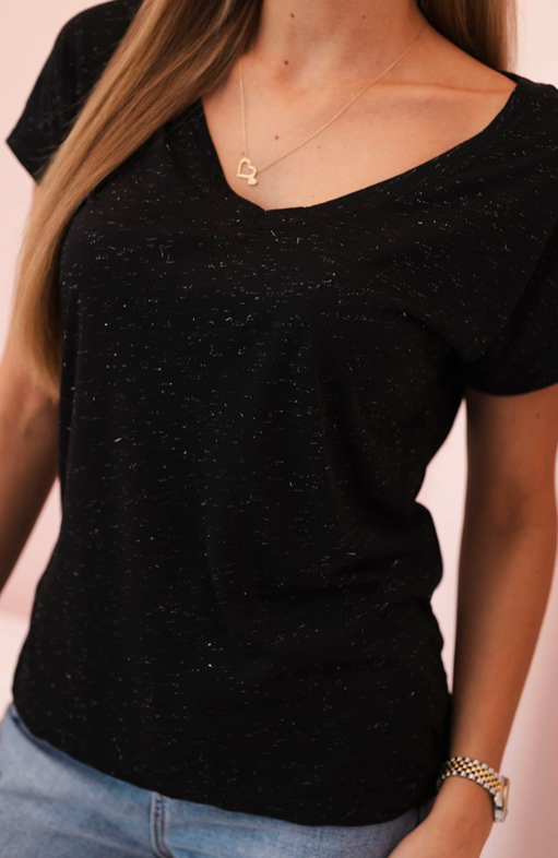 Tá dámska bavlnená blúzka s V výstrihom je ideálny model pre každodenné, pohodlné stylingy. Vyrobená z mäkkej a elastickej pleteniny, skvele sa prispôsobuje postave a poskytuje vysoký komfort nosenia. Klasický strih s podhodenými rukávmi robí blúzku vhodnou ako k džínsom, šortkám, tak aj k sukniam – nadčasový základ, ktorý vždy stojí za to mať v šatníku.